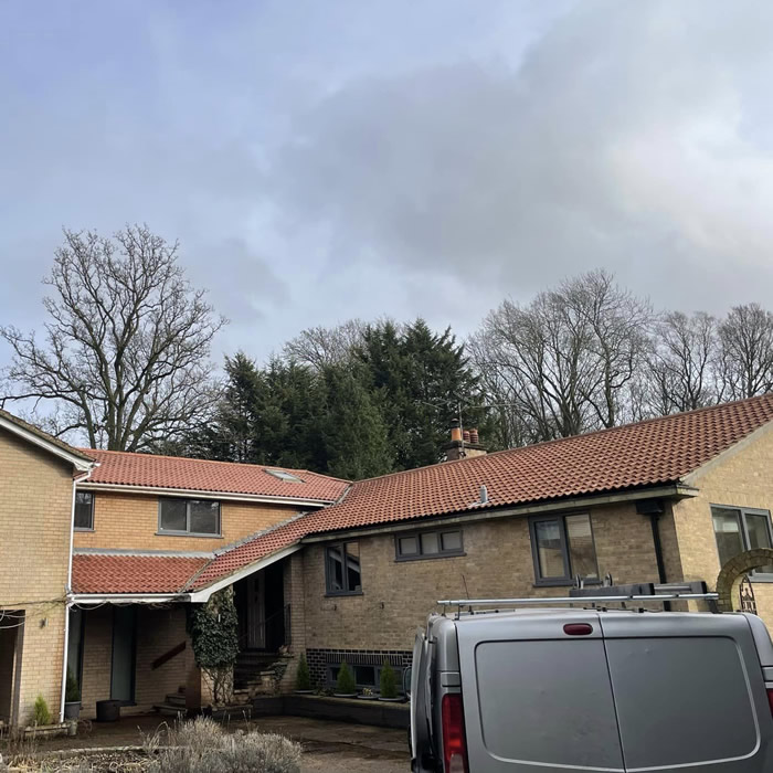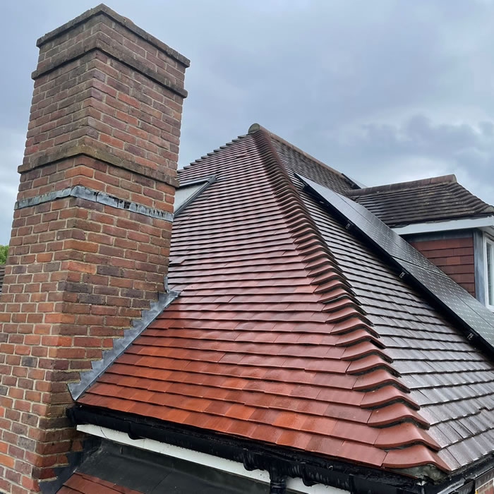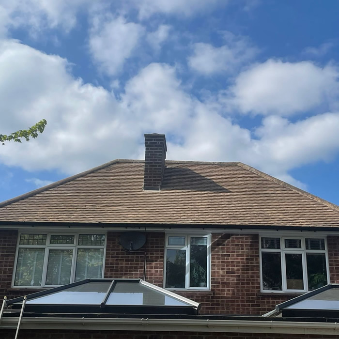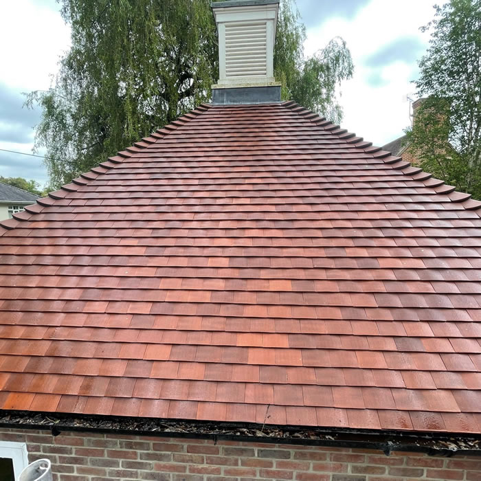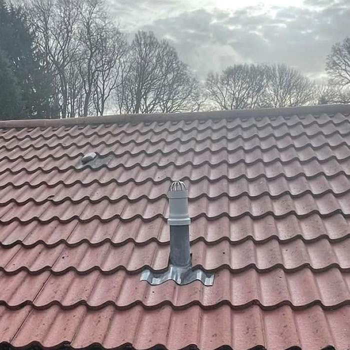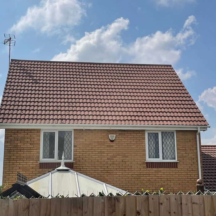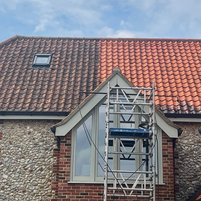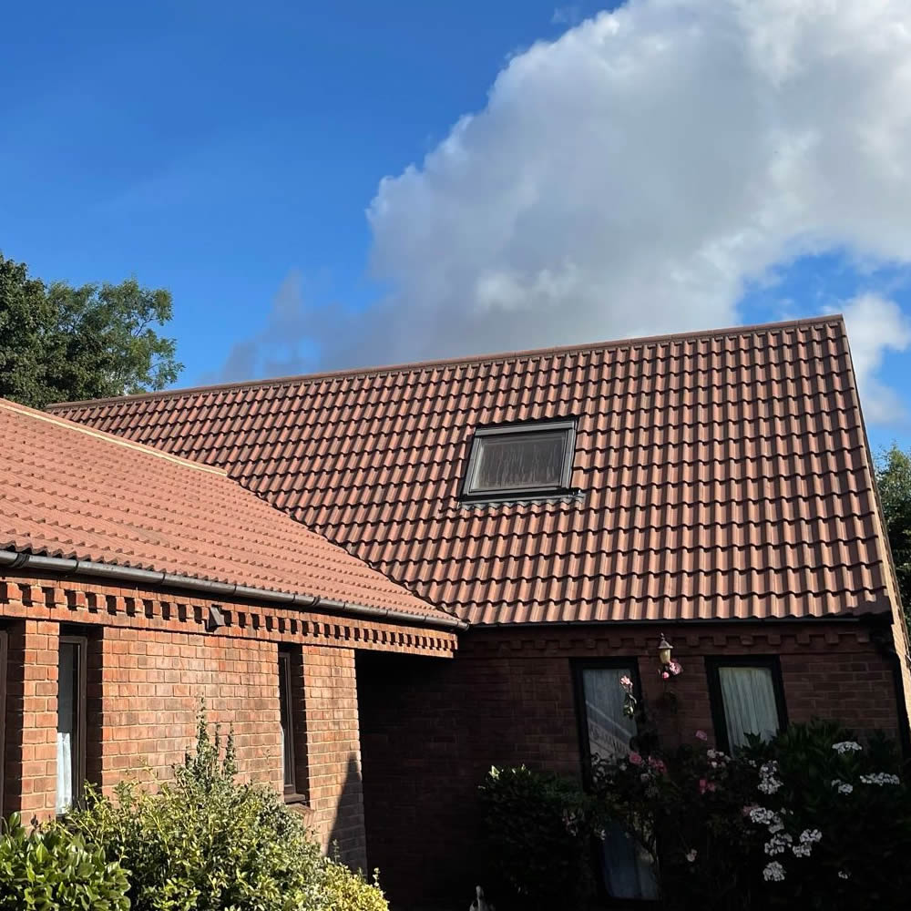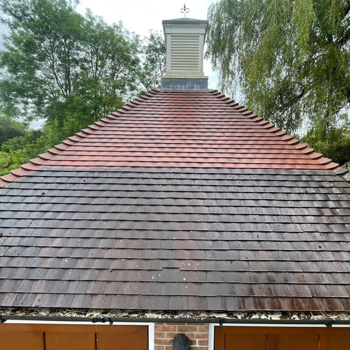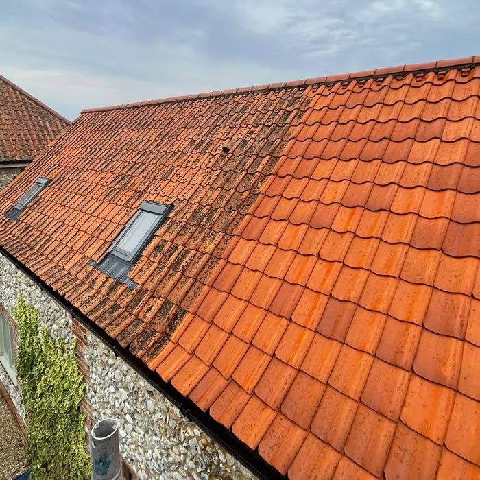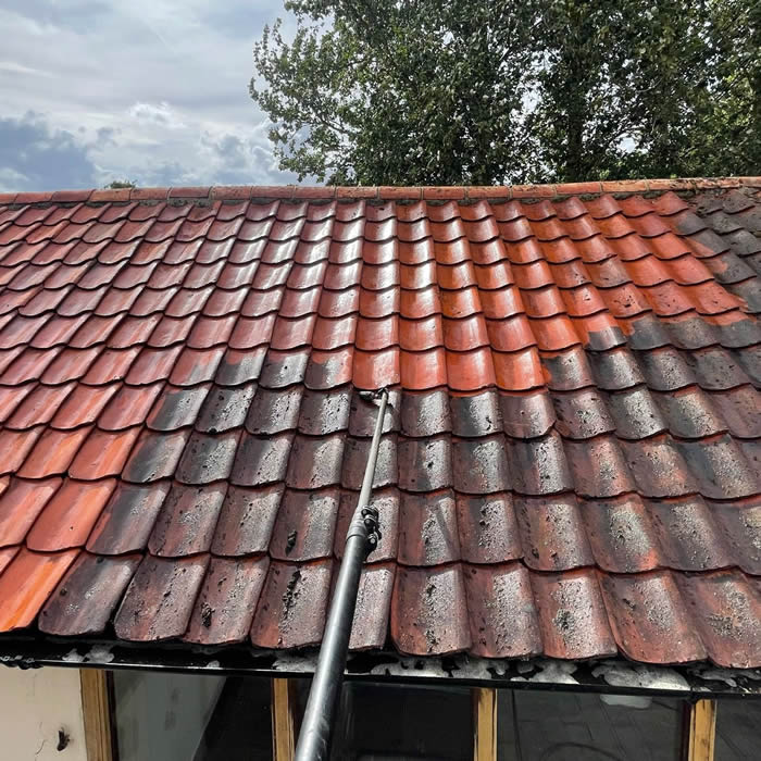 Cleaned red roof tiles restored colour. No lichen, moss or debris