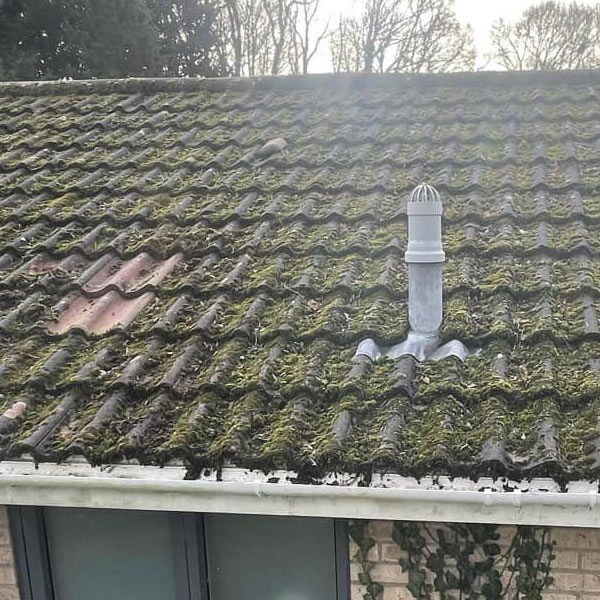 Dirty bungalow roof cleared off lichen, moss and other debris